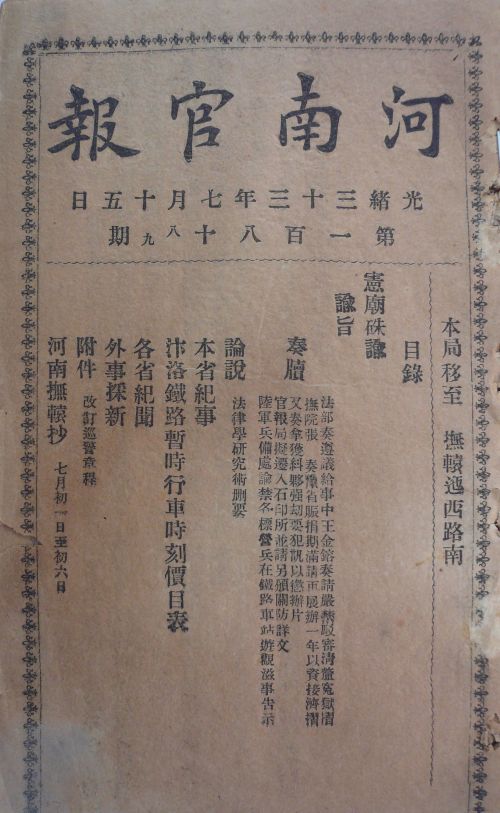 這張列車時刻表是當(dāng)年農(nóng)歷七月十五(公歷9月3日)發(fā)行的《河南官報(bào)》(見圖①)中的一張長方形折頁(見圖②),從這張“汴洛鐵路暫時行車時刻價目表”中可以看出,開行的列車僅僅是在鄭州與開封之間運(yùn)行(開封到洛陽的鐵路在1910年才正式通車,蘭州到連云港這條名為隴海鐵路的開通就更是以后的事了),而且一天只單開一趟。表中由開封到鄭州的車8:35開車,到中牟的時間是9:35,到鄭州的時間是11:05,其間運(yùn)行兩個半小時,由此可見當(dāng)時的火車速度之慢!開封到鄭州之間列車的票價為:頭等座2.4元,二等座1.6元,三等座0.8元。更為有意思的是,隨身攜帶的行李要收取每件0.8元的運(yùn)費(fèi),隨身攜帶的銀錠和銀元也要收費(fèi):1000兩銀子收費(fèi)0.7元,1000元銀元收費(fèi)0.2元。表中規(guī)定,在列車上補(bǔ)票要收費(fèi):客票和行李票按票價0.5倍加價收費(fèi);在車上購買貴重物品票者,按票價1倍加價收費(fèi)。