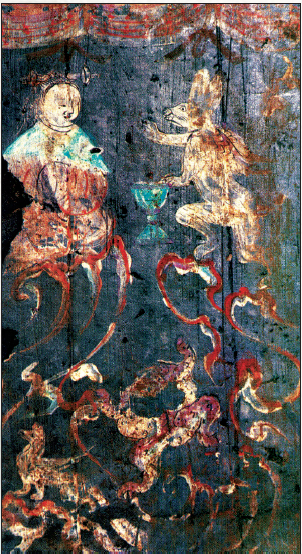 壁畫年代:西漢 出土地點(diǎn):偃師市 這是一幅出土于偃師市新莽壁畫墓中描繪西王母的壁畫。壁畫上的西王母豐腴端莊、拱手端坐在云柱頂端,她面前是一只正在搗藥的玉兔,其下繪有蟾蜍和九尾飛狐。