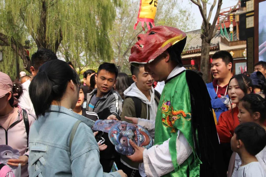 一支主題突出、特色鮮明的大巡游隊伍正在向你走來,送儺面、贈柳帽,與周圍游客互動,虹橋上,上善門下,滿是宋人穿梭而行,呈現(xiàn)出一片祥和、熱鬧的情景。