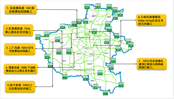 (一)京港澳高速(G4)薛店收費(fèi)站封閉施工,您可以選擇機(jī)場收費(fèi)站或者雙鶴湖收費(fèi)站上下站。(施工時間:2020年9月1日-2021年6月30日)