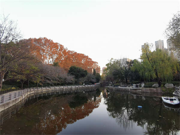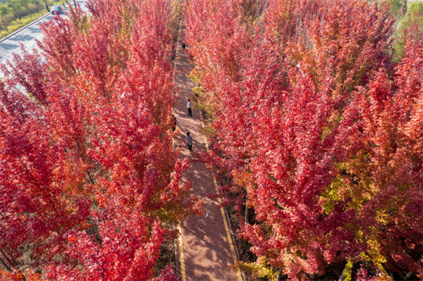 在中央公園萬通街兒童游樂園南側(cè),800余株美國紅楓的葉子由綠變紅,漫步在中央公園的林蔭小路,可謂色彩醉人。