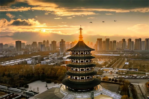 “天青色等煙雨,而我在等你。”落雨過后,高聳入云的天堂巍峨矗立,與不遠(yuǎn)處的高柳建筑交相輝映,穿破云層微微露出的黃暈,與皇家威嚴(yán)碰撞出別樣的秋日浪漫。云透光處,雨過天青,這是心動(dòng)的顏色,夜未央,光影璀璨,這是輝煌的盛唐。