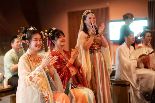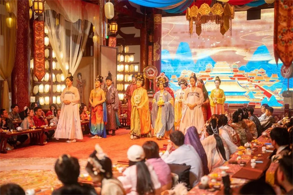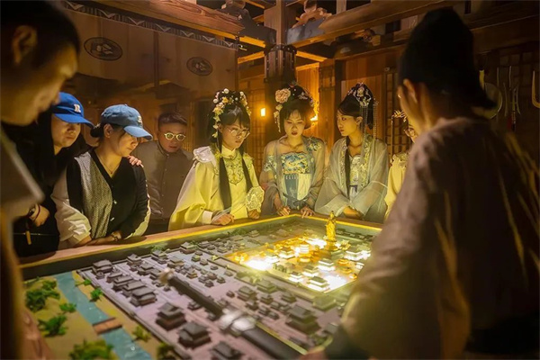 《唐宮樂宴》演出備受游客喜愛,在應(yīng)天門四樓,游客華服換裝,跟隨NPC一起為“武皇”獻(xiàn)禮,開場即夢回千年前隋唐宮宴盛大之景,循禮落座,侍女裊裊而來,“穿越而來”的體驗(yàn)感瞬間爆棚!短扉T有道》演出在應(yīng)天門國際報(bào)告廳,走進(jìn)劇中,逛隋唐集市,體驗(yàn)市井樂趣,感受“來者皆為劇中人”的全方位沉浸式互動(dòng)演藝《天門有道》,帶您探秘紫微城內(nèi)神秘大案。