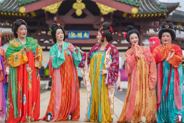 飛檐翹角,雍容華貴,夜晚燈光亮起時(shí),金碧輝煌,氣勢非凡。“貴妃”們著華服、持團(tuán)扇、裙裾飄飄、笑靨嫣然,撩起裙角奔向見證武皇政治巔峰的“隋唐第一門”,隨風(fēng)飄起的長發(fā)和微微顫動(dòng)的頭冠,與富麗堂皇的背景相映襯,鏡頭定格間仿佛穿越,美得讓人心醉。