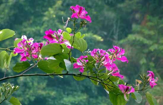 堯山的紫荊多分布于山門以上至黑龍?zhí)兑粠В瑹o論是在深澗幽谷,還是在路旁崖畔、山腰峰頭,隨處都能看到。