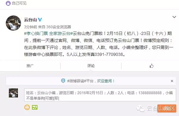在云臺(tái)山官方微博評(píng)論或私信,留下姓名、游覽日期、人數(shù)、聯(lián)系電話、地區(qū)等信息(如下圖)。