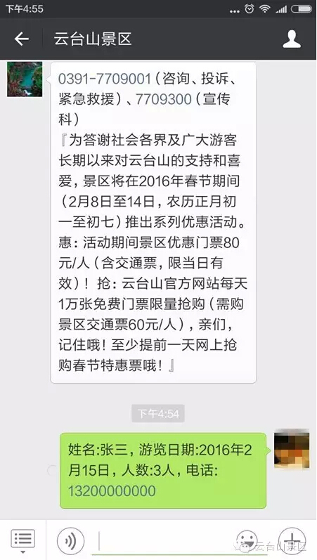 關(guān)注云臺(tái)山官方微信(yuntai300),或長(zhǎng)按下圖二維碼加關(guān)注,給后臺(tái)發(fā)送姓名、游覽日期、人數(shù)、聯(lián)系電話、地區(qū)等信息(如下圖)。
