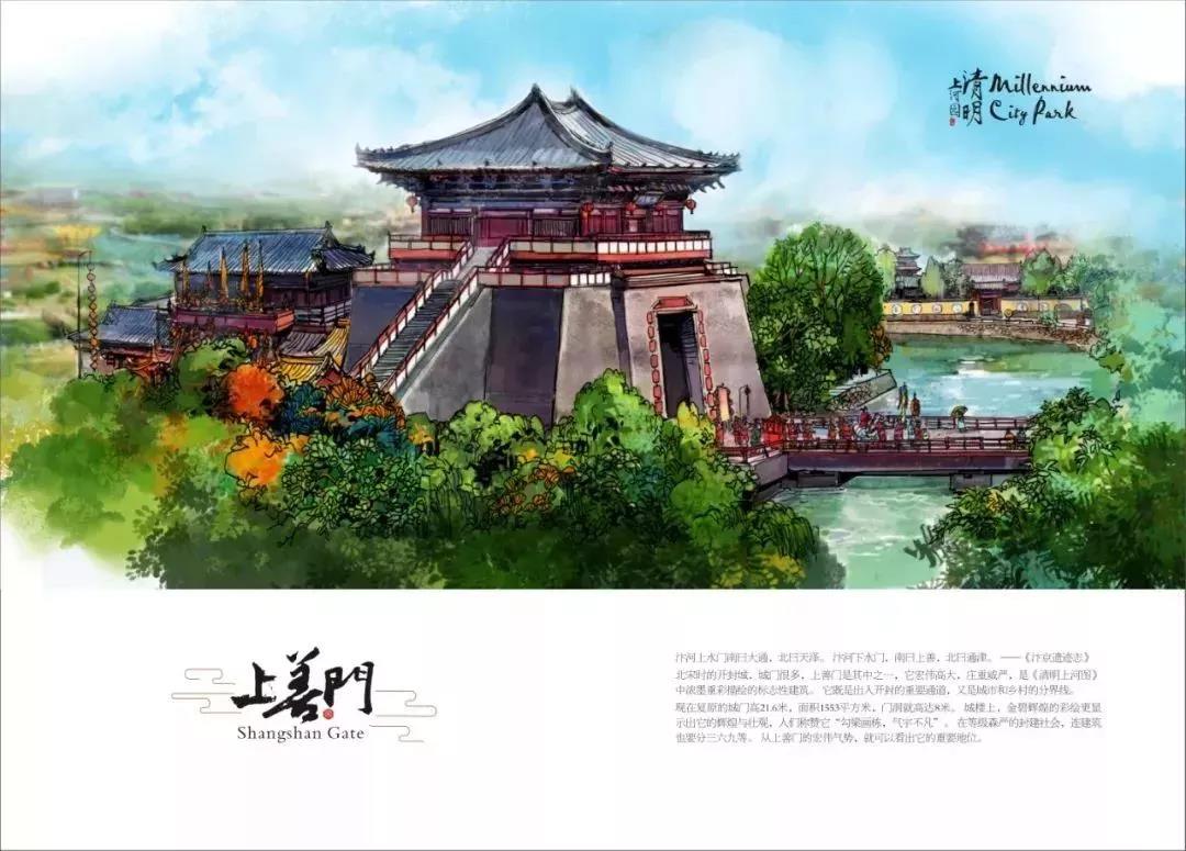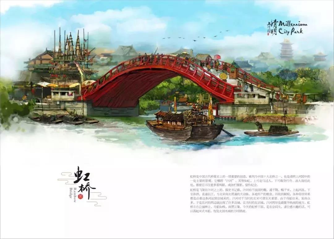 翻開第一頁,超美手繪插畫,還原了清明上河園景區(qū)的繁華熱鬧,虹橋在熙熙攘攘的人群中顯得更有魅力,橫跨“汴河”,氣勢如虹。