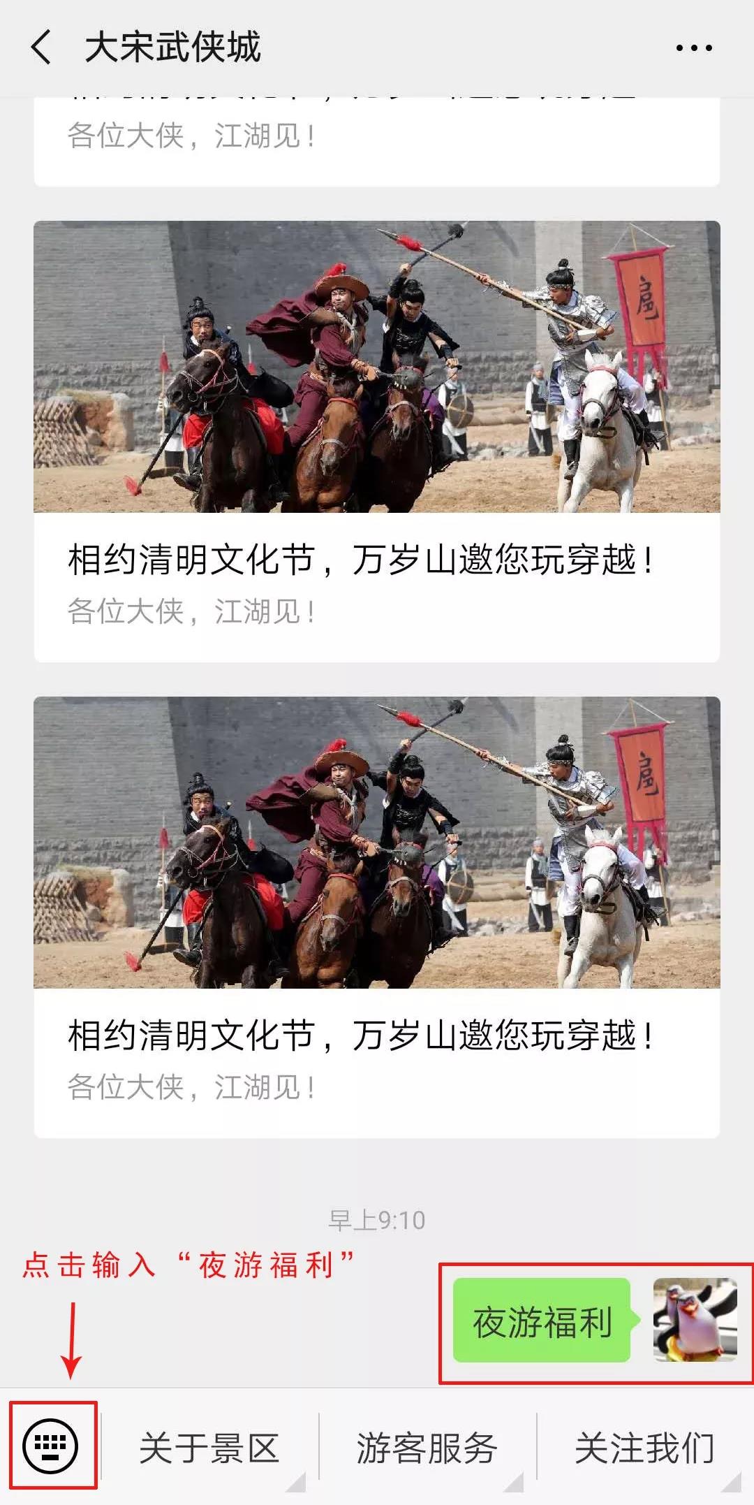 即日起關(guān)注“大宋武俠城”官方公眾號回復(fù)“夜游福利”,根據(jù)文字提示完成活動流程,可享受以下購票特惠!
