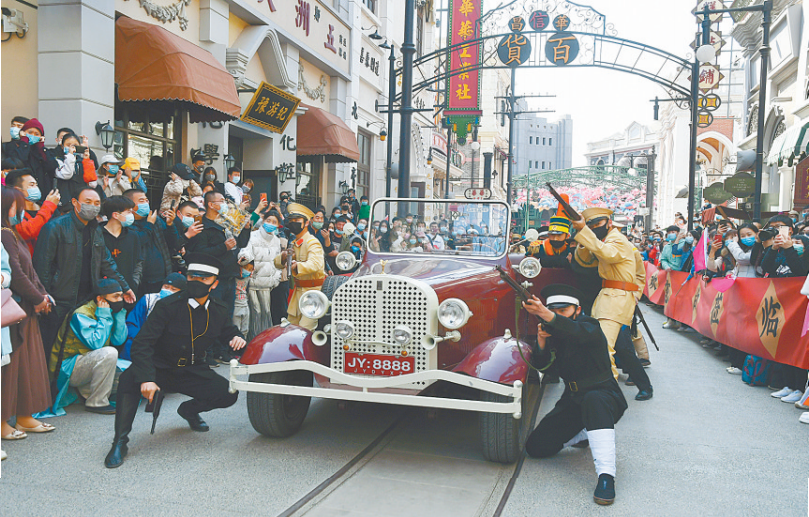 這可不是電影鏡頭,而是電影小鎮(zhèn)帶給游客的真實(shí)體驗(yàn)。在這里,三重時(shí)空、四幕好戲、八大場(chǎng)景讓“既是觀眾,也是演員”的游客“不僅看戲、更會(huì)入戲”。從去年9月底開(kāi)業(yè)以來(lái),上百萬(wàn)游客到電影小鎮(zhèn)“打卡”,享受一場(chǎng)難忘的沉浸式穿越之旅,追尋一個(gè)城市的百年記憶。