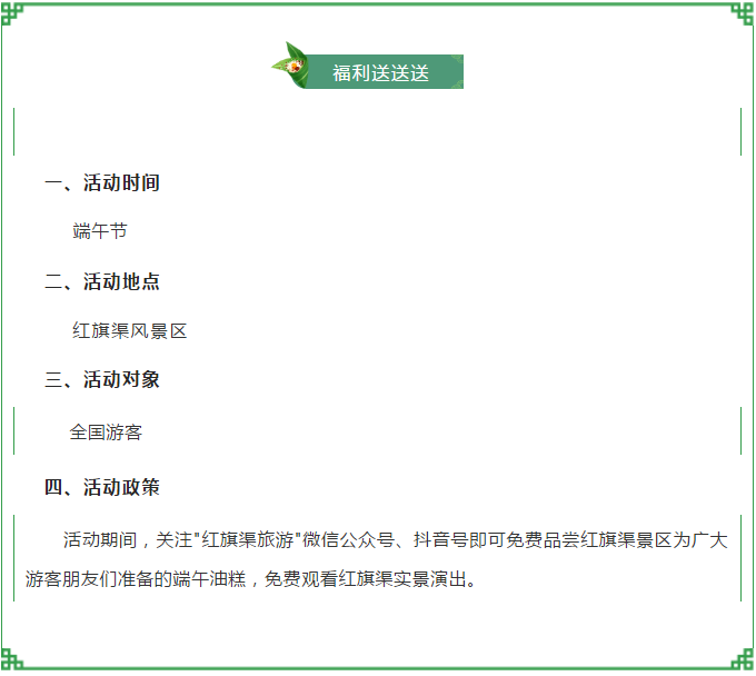 濃濃端午顯真情,紅旗渠福利送不停,送油糕、送實(shí)景演出……風(fēng)景如畫的避暑圣地,邀請(qǐng)您來感受紅旗渠夏天的魅力。