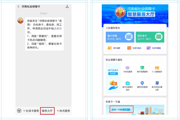 長按或微信掃描二維碼關(guān)注“河南社會保障卡”公眾號,進入“河南社會保障卡”公眾號首頁,進入服務(wù)大廳,先申領(lǐng)電子社?,然后進入“旅游一卡通”服務(wù)。