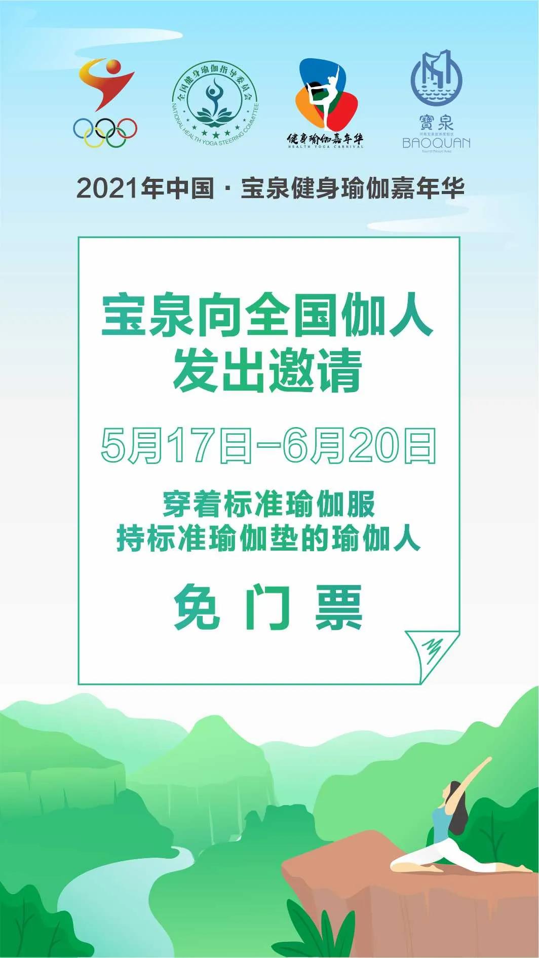 健身瑜伽,山水寶泉;瑜者如山,伽人似水。2021年中國·寶泉健身瑜伽嘉年華驚艷啟幕,5月17日-6月20日瑜伽人免門票啦!即所有瑜伽人著標準瑜伽服、持標準瑜伽墊,僅需購買30元/人交通費即可入園。