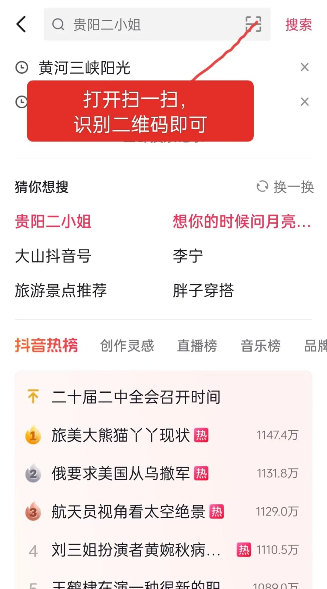 👆2.打開抖音,點擊右上角放大鏡,掃描抖音二維碼加關注