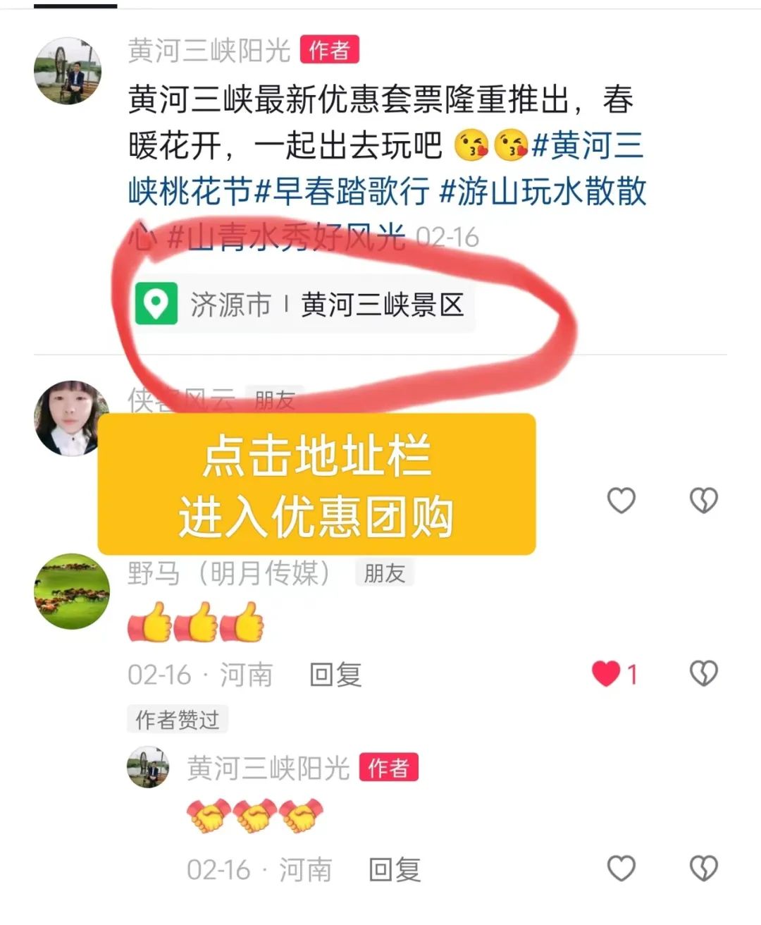 👆4.在視頻左下角點擊地址欄或留言區(qū)點擊地址欄【濟源市 黃河三峽景區(qū)】
