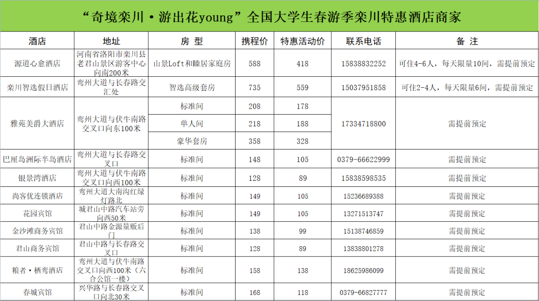 1.縣城區(qū)11家酒店對來欒大學(xué)生(憑學(xué)生證、身份證)推出特惠房間(需提前預(yù)定)。