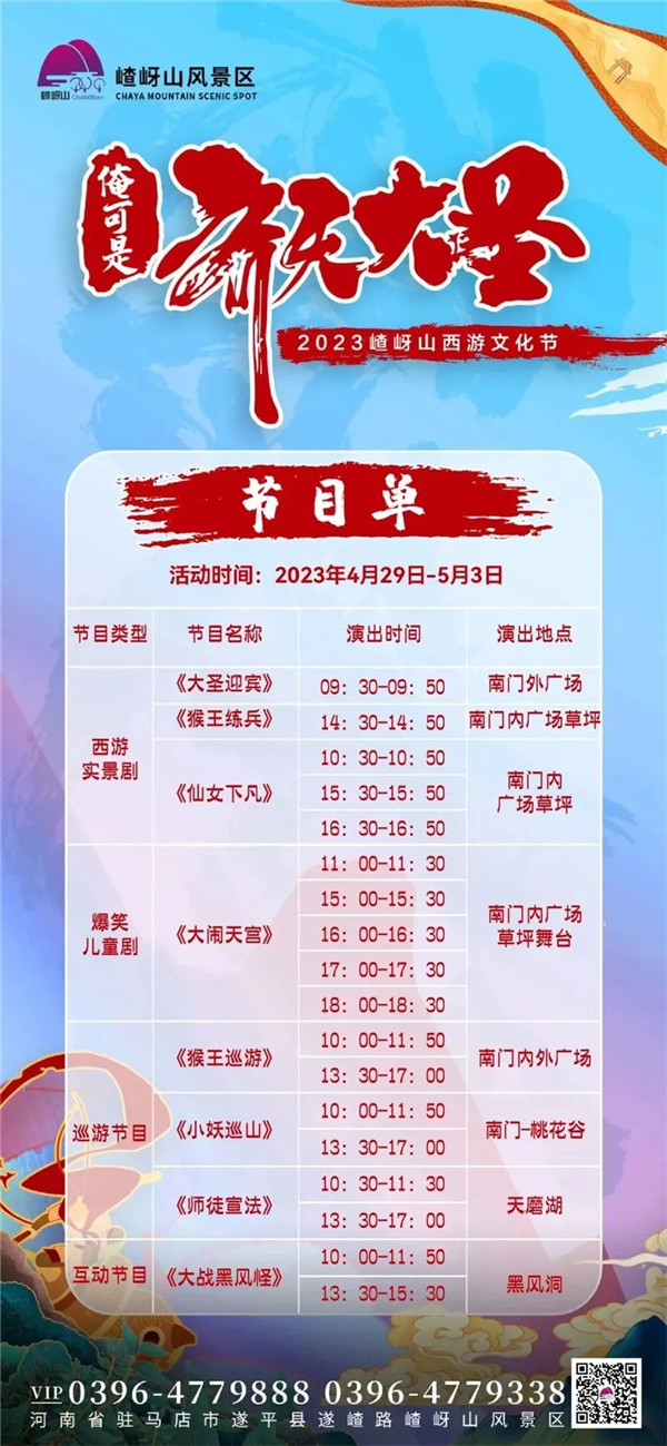 嵖岈山風(fēng)景區(qū)以《西游記》故事為背景,以齊天大圣為主線,精心準(zhǔn)備了西游實(shí)景演出《大圣迎賓》、《猴王練兵》、《大圣降妖》、《仙女下凡》;巡游互動(dòng)節(jié)目《猴王巡游》、《小妖巡山》、《師徒宣法》; 互動(dòng)節(jié)目《大戰(zhàn)黑風(fēng)怪》等精彩節(jié)目,每位游客都有機(jī)會(huì) “ 偶遇孫悟空 ”、“大戰(zhàn)黑熊精”、“邂逅七仙女”、“問路土地公”......;五一勞動(dòng)節(jié)期間(4月29日至5月3日)上演 爆笑兒童劇《大鬧天宮》,帶你重溫經(jīng)典中的經(jīng)典,再現(xiàn)英雄中的英雄。