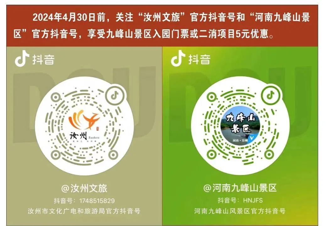 二、2024年4月30日前,關(guān)注“汝州文旅”官方抖音號和“河南九峰山景區(qū)”官方抖音號,享受九峰山景區(qū)入園門票或二消項(xiàng)目5元優(yōu)惠。