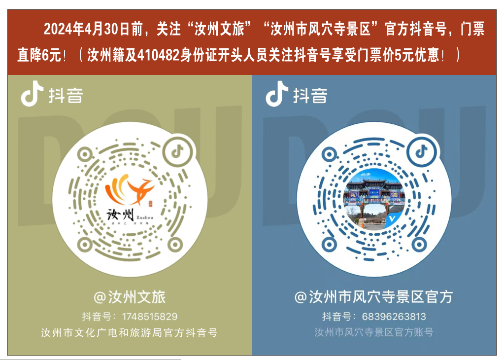 三、2024年4月30日前,關(guān)注“汝州文旅”“汝州風(fēng)穴寺景區(qū)”官方抖音號,門票直降6元!(汝州籍及410482身份證開頭人員關(guān)注抖音號享受門票價5元優(yōu)惠!)