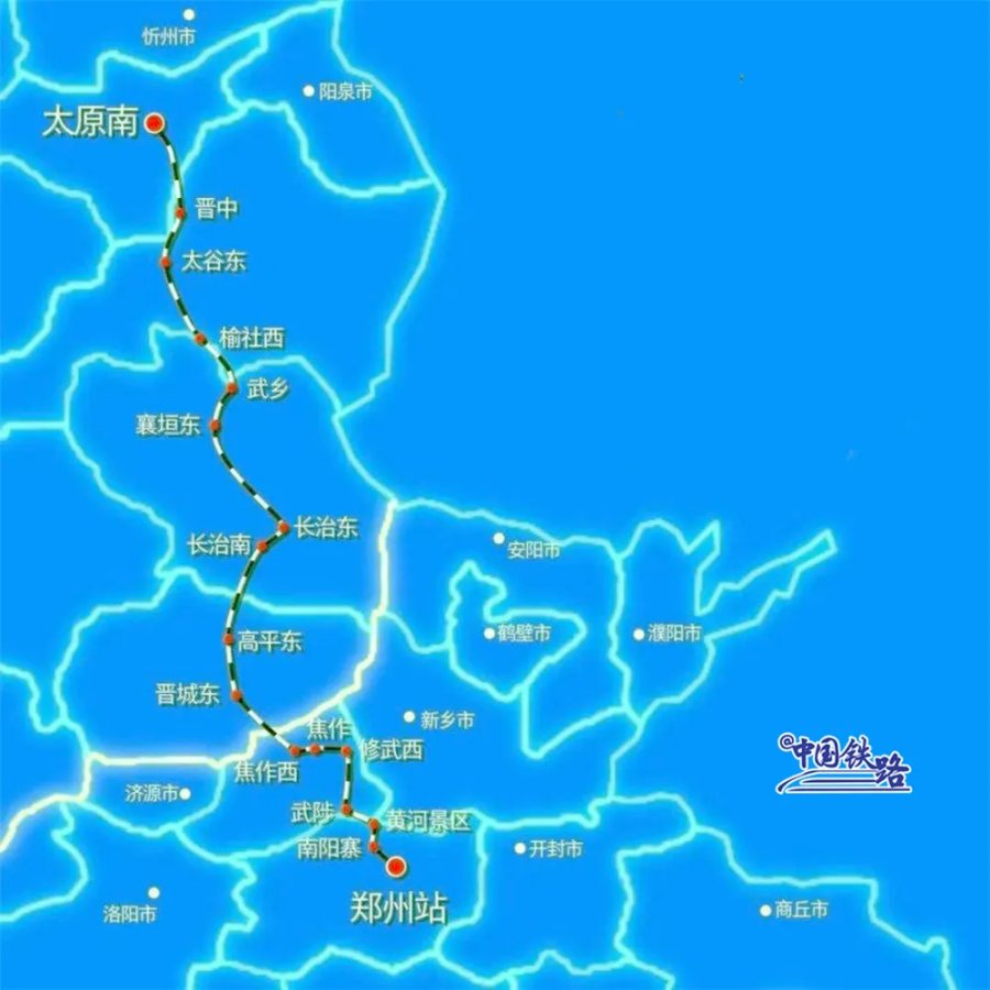 鄭太高鐵設(shè)鄭州、南陽寨、黃河景區(qū)、武陟、修武西、焦作、焦作西、晉城東、高平東、長治南、長治東、襄垣東、武鄉(xiāng)、榆社西、太谷東、晉中、太原南17座車站。