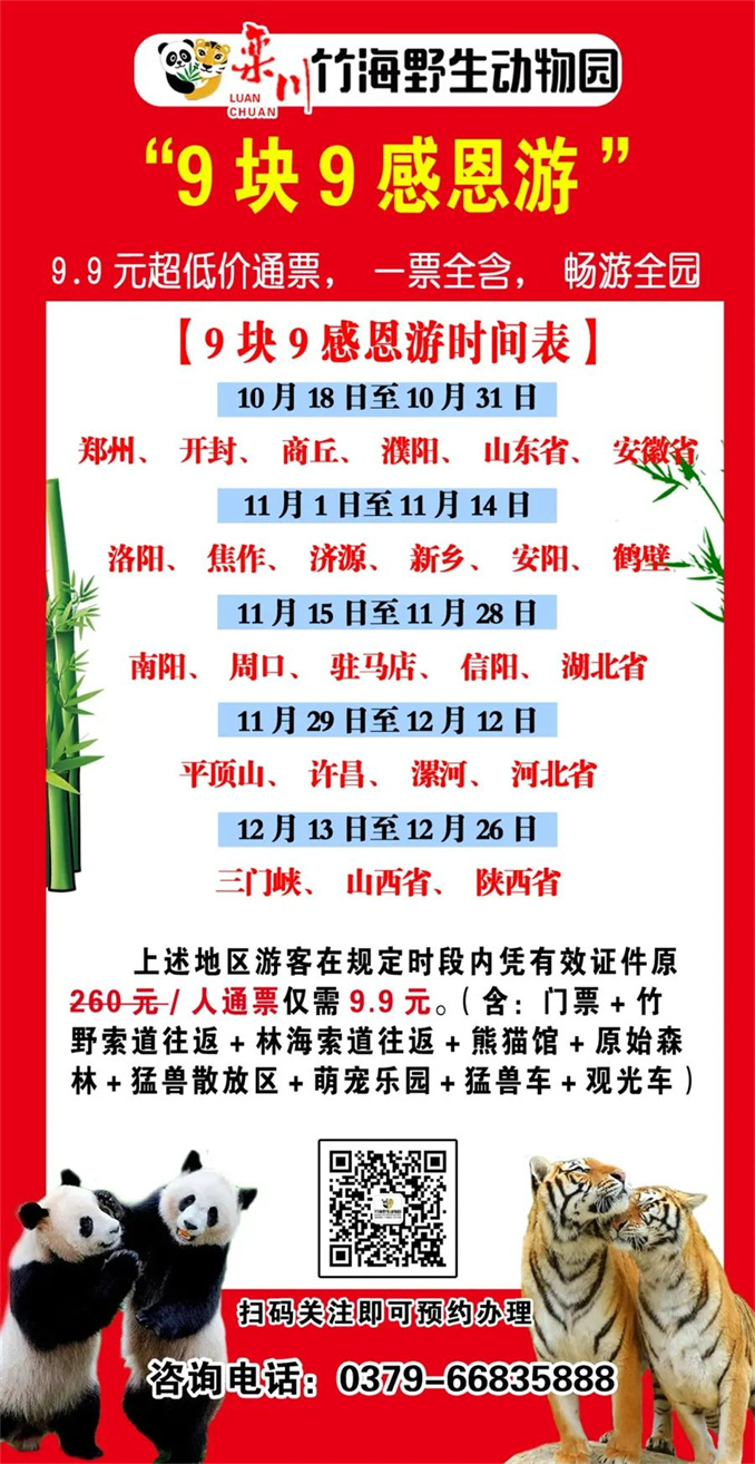 您的關(guān)愛,是我們最美的風(fēng)景,感謝您的一路相伴!欒川竹海野生動物園年末感恩游來啦!2024年10月18日至12月26日,9.9元一票全含,暢游全園(含:門票+竹野索道往返+林海索道往返+熊貓館+原始森林+猛獸散放區(qū)+萌寵樂園+猛獸車+觀光車)。