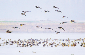 11月18日鄭州黃河濕地迎來了90多只越冬大天鵝。自然保護區(qū)工作人員介紹與往年相比大天鵝“作客”黃河濕地的時間提前了近15天。 11月18日,記者在鄭州黃河濕地花園口段發(fā)現(xiàn)分布區(qū)域十分狹窄的黃嘴白鷺,通過高倍望遠鏡看到黃河邊濕地上一片水域內(nèi)竟然聚了數(shù)百只白琵鷺和反嘴鷸、蒼鷺、豆雁、大白鷺,綠頭鴨以及大天鵝等珍禽混在其中,它們與藍天、黃河相映成趣,成為濕地一道靚麗風(fēng)景。 鄭州黃河濕地自然保護區(qū)管理中心有關(guān)負責(zé)人告訴記者,鄭州黃河濕地是我國鳥類遷徙的重要停歇點、繁殖地和覓食地。豐富的水草資源,良好的生態(tài)環(huán)境吸引了大批鳥類到鄭州黃河濕地自然保護區(qū)棲息覓食,每年11月是候鳥遷徙的高峰期和“黃金季”。 從觀測數(shù)據(jù)來看,今年在濕地保護區(qū)越冬的鳥類以雁鴨類為主。11月4日觀測到的一群豆雁其數(shù)量達到了3020只,它們成群地在空中飛翔,在灘涂草叢中覓食,場面十分壯觀。今年在此停歇和越冬的鳥類比以往數(shù)量更多,種群更大。據(jù)計算,各種水鳥達30多萬只。 水鳥是監(jiān)測濕地生態(tài)環(huán)境的重要指標性生物!鞍嬴B翔集,有鳳來兮”,說明濕地生態(tài)環(huán)境良好,人與自然和諧相處;如果水鳥減少,說明濕地生態(tài)差,水鳥棲息環(huán)境惡劣。林業(yè)專家認為,鄭州黃河濕地生態(tài)保護力度不斷加強,環(huán)境變好,是鳥類聚集鄭州市的主要原因。 |
