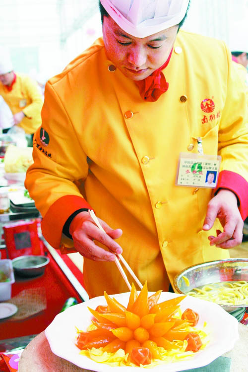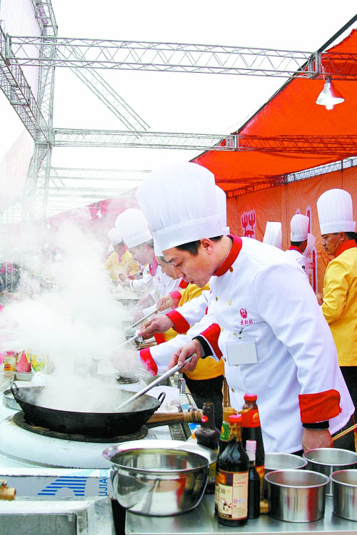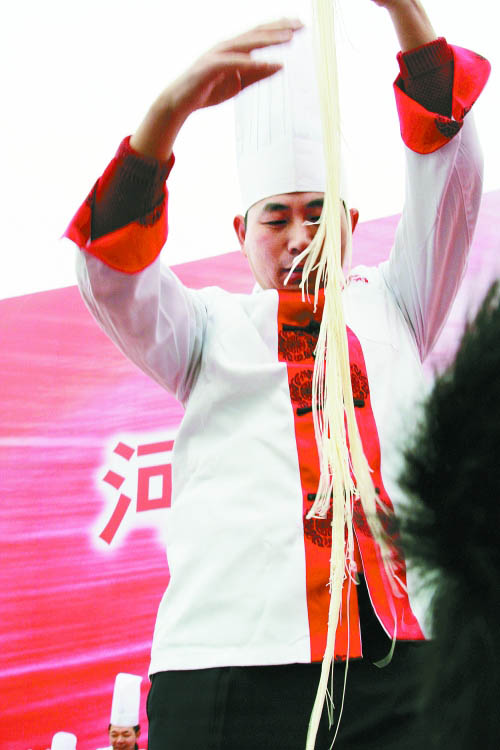 氣球上切肉、蒙眼腿上切肉絲、用笨拙的大刀把蘿卜雕刻成飛鳥、用大蔥蘸醬油寫出的蒼勁書法,拉出的龍須面火機(jī)一點(diǎn)就著……12月1日,漯河4萬(wàn)平方米的漯河市科教文化廣場(chǎng)成了一個(gè)熱鬧的“大廚房”,平時(shí)身居幕后勞作的100多名豫菜大廚,亮出刀工、包制、翻鍋、拉面、面點(diǎn)等絕活斗法。
