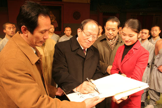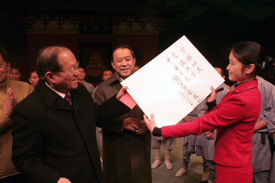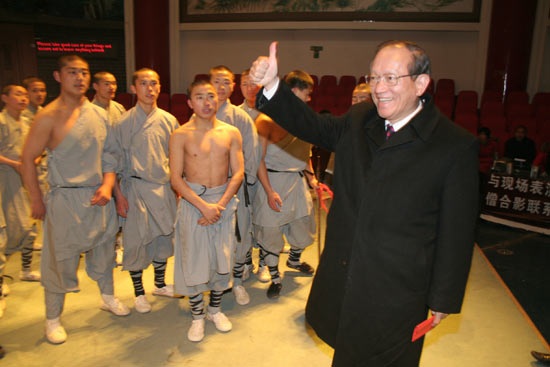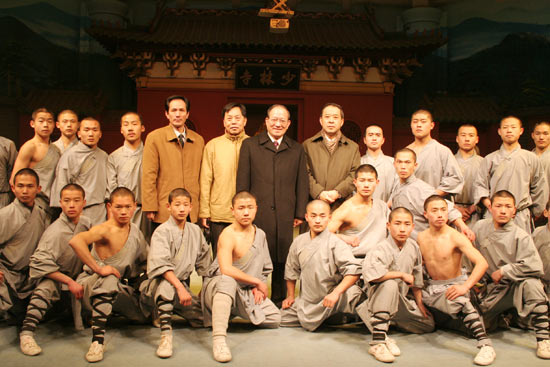 鐘榮吉對武術(shù)館功夫表演給予了高度評價,伸出拇指連連稱贊。演出結(jié)束后,鐘榮吉親切登臺慰問表演隊員,并合影留念,欣然為武術(shù)館題詞:“少林功夫、名滿天下、中國之光”。