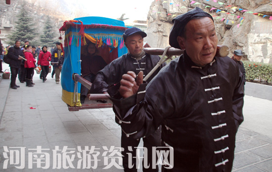 幾位“轎夫”抬著一位老年游客在云夢山景區(qū)游玩,歡度元宵。為給廣大游客提供一個(gè)良好的游覽、參與環(huán)境,中華第一古軍校河南淇縣云夢山風(fēng)景區(qū)在春季旅游高峰期推出了唱大戲、座花轎、推鐵圈等一些節(jié)目,受到廣大游客的歡迎。這些節(jié)目將一直持續(xù)到農(nóng)歷三月三。