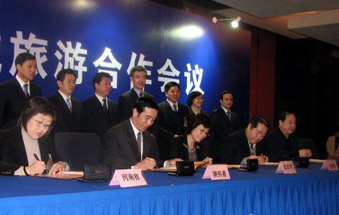 以北京舉辦奧運(yùn)會(huì)為契機(jī),以兩省市特殊的區(qū)位條件和豐富的旅游資源為依托,本著“優(yōu)勢(shì)互補(bǔ)、互利共贏”的合作原則,經(jīng)協(xié)商決定建立兩省市旅游合作機(jī)制,并達(dá)成以下協(xié)議: 一、政府主導(dǎo),建立兩省市旅游合作機(jī)制 (一)在兩省市成立的省級(jí)聯(lián)合工作機(jī)構(gòu)領(lǐng)導(dǎo)下,成立兩省市旅游局長(zhǎng)聯(lián)席會(huì)議制度。每年定期輪流召開(kāi)兩省市旅游局局長(zhǎng)參加的聯(lián)席會(huì),負(fù)責(zé)落實(shí)聯(lián)合工作機(jī)構(gòu)部署的涉及旅游方面的各項(xiàng)工作。通報(bào)兩省市旅游發(fā)展的情況,交流經(jīng)驗(yàn)。聯(lián)席會(huì)議應(yīng)針對(duì)兩省市旅游合作與發(fā)展中亟待解決的普遍性問(wèn)題進(jìn)行專題研究,商討對(duì)策,并鼓勵(lì)支持兩省市旅游局相關(guān)業(yè)務(wù)處室的交流與合作。 (二)設(shè)立固定的聯(lián)絡(luò)和工作機(jī)構(gòu)。兩省市旅游局明確負(fù)責(zé)區(qū)域合作的具體負(fù)責(zé)人和主責(zé)部門,負(fù)責(zé)協(xié)調(diào)兩省市旅游局長(zhǎng)聯(lián)席會(huì)議相關(guān)事宜,處理兩省市旅游合作交流的日常工作。 二、聯(lián)合促銷,打造兩省市旅游品牌和形象 (一)全方位加強(qiáng)兩省市旅游宣傳的深度合作,創(chuàng)新合作機(jī)制,相互支持各自舉辦的旅游促銷活動(dòng),實(shí)現(xiàn)兩地旅游資源共享。鼓勵(lì)和倡導(dǎo)兩省市互為旅游客源地,互為旅游目的地。聯(lián)合參加國(guó)際重要旅游展覽會(huì),共同拓展國(guó)內(nèi)外旅游市場(chǎng),在各自印制的旅游宣傳品上免費(fèi)宣傳對(duì)方的旅游資源和旅游產(chǎn)品,共同打造兩省市旅游品牌和形象。 (二)整合各自優(yōu)勢(shì)資源,突出地方特色,共同打造兩省市精品旅游線路,形成能夠滿足國(guó)內(nèi)外不同客源群體需要的旅游產(chǎn)品體系。 (三)實(shí)現(xiàn)兩省市官方旅游網(wǎng)站的相互鏈接,同時(shí)積極利用政府信息網(wǎng)、官方旅游網(wǎng)宣傳兩省市旅游政務(wù)、旅游資源、旅游產(chǎn)品、旅游項(xiàng)目和旅游節(jié)慶活動(dòng)。 (四)實(shí)現(xiàn)兩省市旅游咨詢站(點(diǎn))的資源共享,共同開(kāi)展旅游咨詢活動(dòng)。 三、增進(jìn)交流,推動(dòng)兩省市旅游產(chǎn)業(yè)的可持續(xù)發(fā)展 (一)加強(qiáng)旅游目的地的建設(shè)和交通、住宿、餐飲等旅游服務(wù)設(shè)施的建設(shè)和管理。 (二)建立兩省市共享的旅游招商項(xiàng)目庫(kù),提供各自在旅游投資方面的優(yōu)惠政策,為旅游投資者提供旅游投資的權(quán)威信息,引導(dǎo)和鼓勵(lì)投資者獨(dú)立或聯(lián)合開(kāi)發(fā)區(qū)域內(nèi)旅游項(xiàng)目。 (三)支持旅游企業(yè)加強(qiáng)合作,鼓勵(lì)大型旅游企業(yè)、著名旅游管理公司和知名旅游品牌實(shí)現(xiàn)跨省市經(jīng)營(yíng)、連鎖經(jīng)營(yíng)和品牌輸出,提升兩省市旅游產(chǎn)業(yè)整體素質(zhì)。 (四)加強(qiáng)兩省市在人才培養(yǎng)和在職培訓(xùn)領(lǐng)域的合作,促進(jìn)兩省市旅游從業(yè)人員整體素質(zhì)的提高和旅游人力資源在兩省市間的合理流動(dòng),形成人力資源的合理配置。