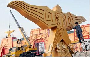 3尊金色玄鳥雕塑是前天晚上由鄭州運(yùn)抵商丘的,在商丘完成了組裝和噴漆,昨日下午,施工人員開(kāi)始安裝。據(jù)三商之門設(shè)計(jì)者———河南大學(xué)古建園林設(shè)計(jì)研究院院長(zhǎng)張家泰介紹,這3尊金色玄鳥雕塑最大的高5.5米,雙翅展開(kāi)寬8米,兩個(gè)小的高3.4米,雙翅展開(kāi)寬5米。玄鳥雕塑之所以被漆成金色,是因?yàn)椤对?shī)經(jīng)》里有“天命玄鳥,降而生商”的詩(shī)句。玄鳥降而生商,繁榮了商部落,受了天意的玄鳥就是神鳥,漆成金色具有神話意味。在效果上,3個(gè)金色的玄鳥與紅色的墩臺(tái)搭配,不僅形成了3個(gè)巨大的商字,又顯得極為紅火壯觀。