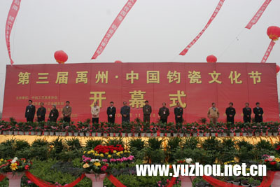 11月18日,鑼鼓喧天,彩旗飄揚(yáng),由中國工藝美術(shù)協(xié)會、河南省中小企業(yè)服務(wù)局、河南省工藝美術(shù)協(xié)會、河南省“中國鈞瓷”評定委員主辦,禹州市人民政府承辦的第三屆禹州中國鈞瓷文化節(jié)在禹州市穎河迎賓館廣場隆重開幕。原河南省人大常委會副主任、河南省工藝美術(shù)協(xié)會名譽(yù)理事長侯志英、河南省“中國鈞瓷”評定委員會主任、省人大科教文衛(wèi)副主任常有功、河南省中小企業(yè)服務(wù)局副局長王傳捷、中國工藝美術(shù)協(xié)會副理事長兼秘書長王山、中國工藝美術(shù)協(xié)會副理事長、河南省工藝美術(shù)協(xié)會理事長張玉驫、河南省工藝美術(shù)協(xié)會副理事長兼秘書長田任午、河南省工藝美術(shù)學(xué)會秘書長王俊容、河南省工藝美術(shù)行業(yè)協(xié)會秘書處方清媚、河南省“中國鈞瓷評定委員會”辦公室主任胡曉謙、中國陶瓷工業(yè)協(xié)會會長楊自鵬、中國陶瓷工業(yè)協(xié)會副秘書長毛增印、河南省陶瓷玻璃協(xié)會會長王愛純、中國工藝美術(shù)協(xié)會副理事長、浙江省工藝美術(shù)行業(yè)協(xié)會理事長吳祖熙,許昌市委書記毛萬春,禹州市領(lǐng)導(dǎo)周庚寅、張明山、劉英杰、申國民、董立民、李英杰、唐群喜等出席了開幕式。