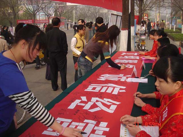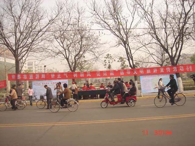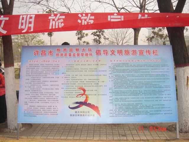 在宣傳活動(dòng)現(xiàn)場,由許昌市48家旅行社、星級(jí)飯店、旅游景區(qū)精心制作的60多塊展板,圖文并茂的展示了各種不文明行為,各旅游企業(yè)還積極向市民宣傳推介許昌旅游景區(qū)、促使市民更多的了解本地旅游景區(qū),為五一“黃金周”出游提供更多選擇。在旅游咨詢、旅游投訴臺(tái)前,市旅游監(jiān)察大隊(duì)、旅游質(zhì)監(jiān)所的工作人員,耐心細(xì)致地回答游客提出的各種問題,接受旅游咨詢、投訴50余件,并發(fā)放宣傳彩頁1000多份。旅游從業(yè)人員和市民群眾積極響應(yīng)文明旅游號(hào)召,踴躍在橫幅上簽下自己的名字。