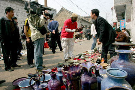 4月10日,東方衛(wèi)視“車游天下”海外版欄目組派出強力采訪團隊,赴神鎮(zhèn)進行實地采訪,他們走街串巷,以淘寶的形式為線索,去發(fā)現(xiàn)鈞瓷,繼而對孔家鈞窯、手工作坊、鈞瓷的制作工藝等進行了詳細拍攝。(圖為主持人大龍在古玩一條街采訪的情景。)