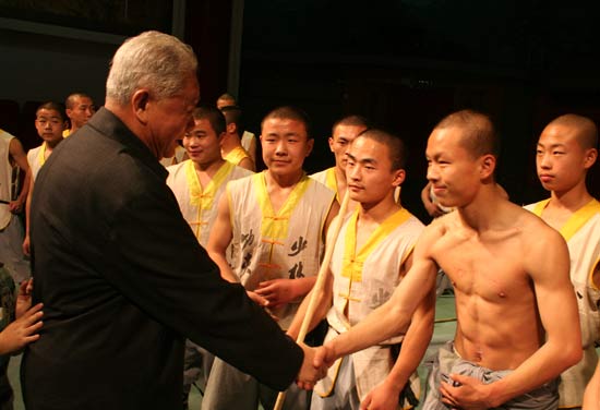 53日上午,全國人大常委會副委員長盛華仁一行在省市有關(guān)領(lǐng)導(dǎo)王文超、王明義和少林寺武術(shù)館書記郭新華的陪同下到少林景區(qū)參觀考察,并在武術(shù)館觀看少林功夫表演。