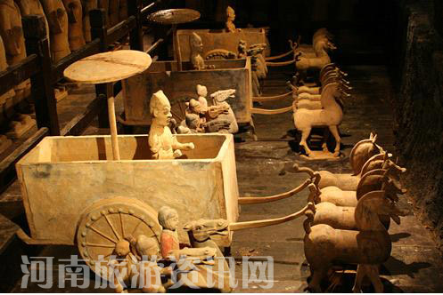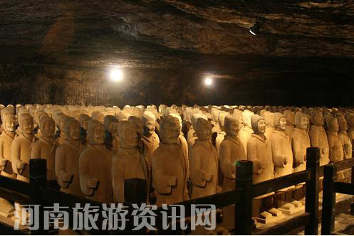 日前,一批復(fù)制的陶制漢代兵馬俑被充填到芒碭山景區(qū)的梁孝王陵內(nèi),漢代兵馬俑充填不僅體現(xiàn)了墓主人當(dāng)時的權(quán)威和地位,更提高了此陵觀賞性。 此次充填的有騎俑、侍俑、車馬俑等共400余個,數(shù)量之多、規(guī)模之大,在芒碭山景區(qū)的文物復(fù)制品充填中尚數(shù)首次。每個兵馬俑高約1.5米,重近50公斤,神態(tài)各異、氣勢恢宏 。“兵馬俑陳列整齊、非常壯觀,特別是衣著和帽子很符合漢代特點,在燈光的映射下,十分逼真,我們很喜歡”。許多游客在看后都給予了很好的評價。