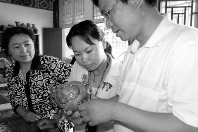 “請幫忙看看我的這件是不是真的……”一市民小心翼翼地拿出做工精美的銅壺和石硯,請安陽市博物館副館長趙清榮和保管部主任賀貴明鑒定!白钤缡乔迥┟駠鴷r(shí)期的物品,不過做工不錯(cuò),自己觀賞還可以!辟R貴明仔細(xì)看了看,對文物作出了準(zhǔn)確鑒定。僅當(dāng)日下午,專家們就為市民免費(fèi)鑒定了數(shù)十件“文物”。這是6月9日袁林景區(qū)為市民們開展的一次免費(fèi)文物鑒定和文物知識(shí)咨詢活動(dòng)。