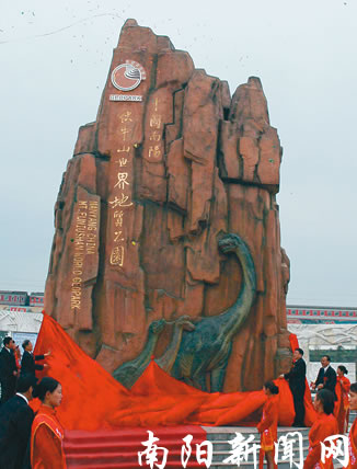 巍巍伏牛迎嘉賓,滔滔鸛河盡歡顏。6月20日上午的西峽恐龍地質(zhì)廣場,鑼鼓喧天,彩旗飛揚。南陽市隆重舉行中國·南陽伏牛山世界地質(zhì)公園揭碑開園儀式。這標志著南陽秀美伏牛、神秘伏牛從此邁出國門,走向了世界。
