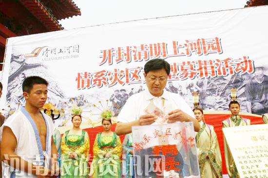 昨天上午10時,在國家4A級旅游景區(qū)——開封清明上河園門前,身著宋裝的“包大人”帶領“王朝”、“馬漢”慷慨解囊,為災區(qū)人民捐款。隨后,景區(qū)的500多名員工及商戶紛紛捐款,當活動進行到當日下午16時,共為信陽災區(qū)捐款五萬六千多元。