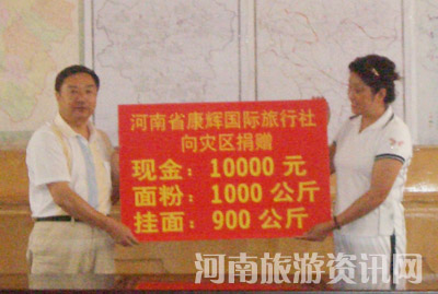 8月13日,受省旅游局委托,省旅游局直屬單位黨委和河南省康輝國際旅行社代表局機(jī)關(guān)和旅游企業(yè),將捐款送往盧氏縣生產(chǎn)救災(zāi)辦公室;并將捐助物資親自送到了盧氏縣官坡鎮(zhèn)河口村和回莊村災(zāi)民手中。