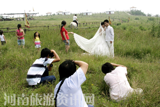七月初七,是中國(guó)的“情人節(jié)”,很多熱戀的情人都選擇這個(gè)節(jié)日來(lái)拍攝自己的婚紗照片。鶴壁云夢(mèng)山景區(qū)大草原上自然景觀優(yōu)美,人文景觀獨(dú)特,交通便利,特別適合拍攝外景婚紗照片,許多準(zhǔn)備結(jié)婚的情人都選擇這里來(lái)拍攝婚紗照。據(jù)悉,今年七夕前后鶴壁市有近30對(duì)“新郎新娘”在云夢(mèng)大草原上拍攝了婚紗照。