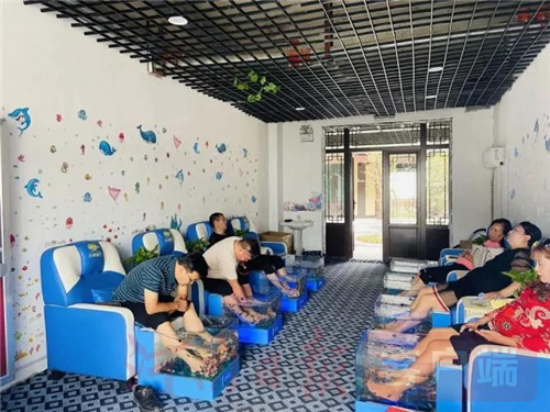 做魚療不用去泰國,這個,云臺古鎮(zhèn)可以有。背靠沙發(fā)安然而坐,雙腳放在前面水缸之中,看游魚萬千按摩足底,仿佛置身于云臺山境,青天河畔!魚療結(jié)束,渾身舒泰,妙不可言。