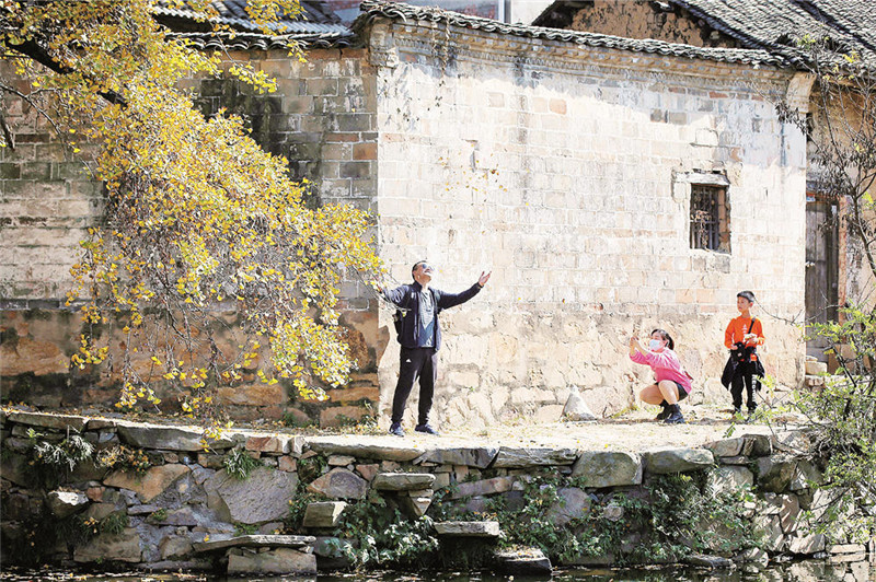游人紛紛拿出相機(jī)手機(jī)拍起照來,或給自己,或?yàn)榧胰;來自民間的藝人們,在樹下或表演著太極扇,或彈奏著古琴,婉轉(zhuǎn)優(yōu)雅;山貨一條街上,柿子、板栗、木耳等山貨引來一批又一批游人前來購(gòu)買……