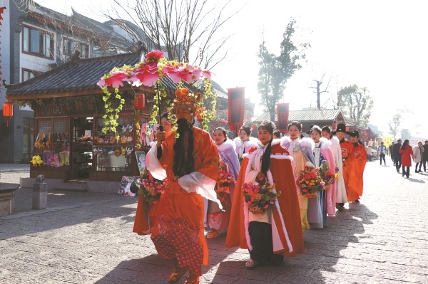 古裝快閃表演,吸引大批游客觀看。王曉晶 攝