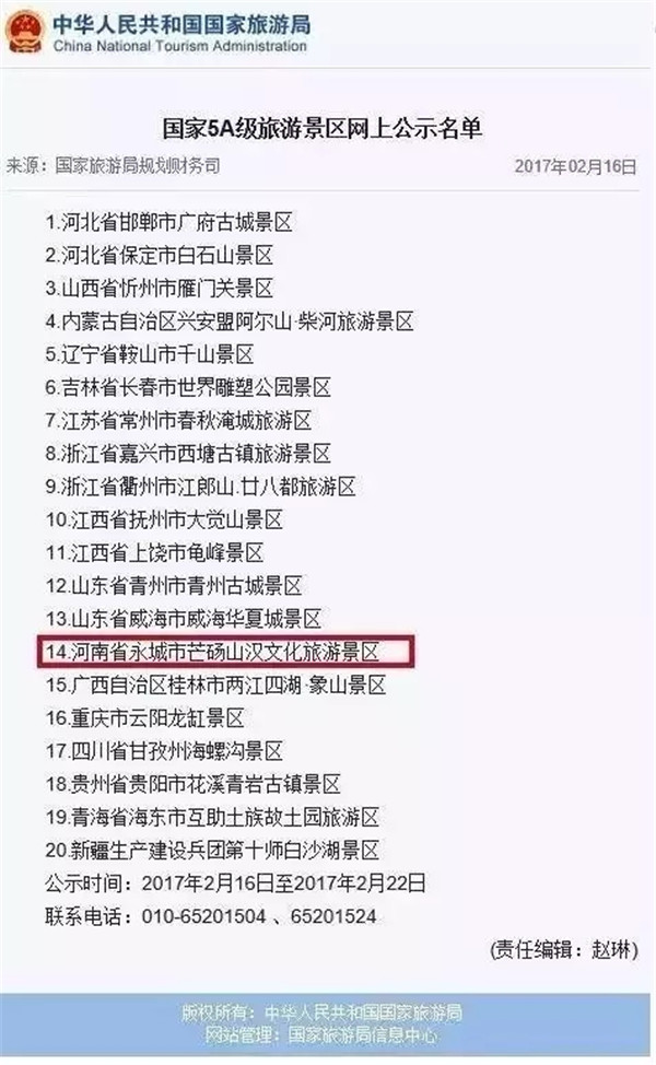 2月16日,國(guó)家旅游局官網(wǎng)發(fā)布《國(guó)家5A級(jí)旅游景區(qū)網(wǎng)上公示名單》,全國(guó)本次共計(jì)20個(gè)景區(qū)上榜,河南省永城市芒碭山漢文化旅游景區(qū)榜上有名,公示時(shí)間從2月16日至2月22日。
