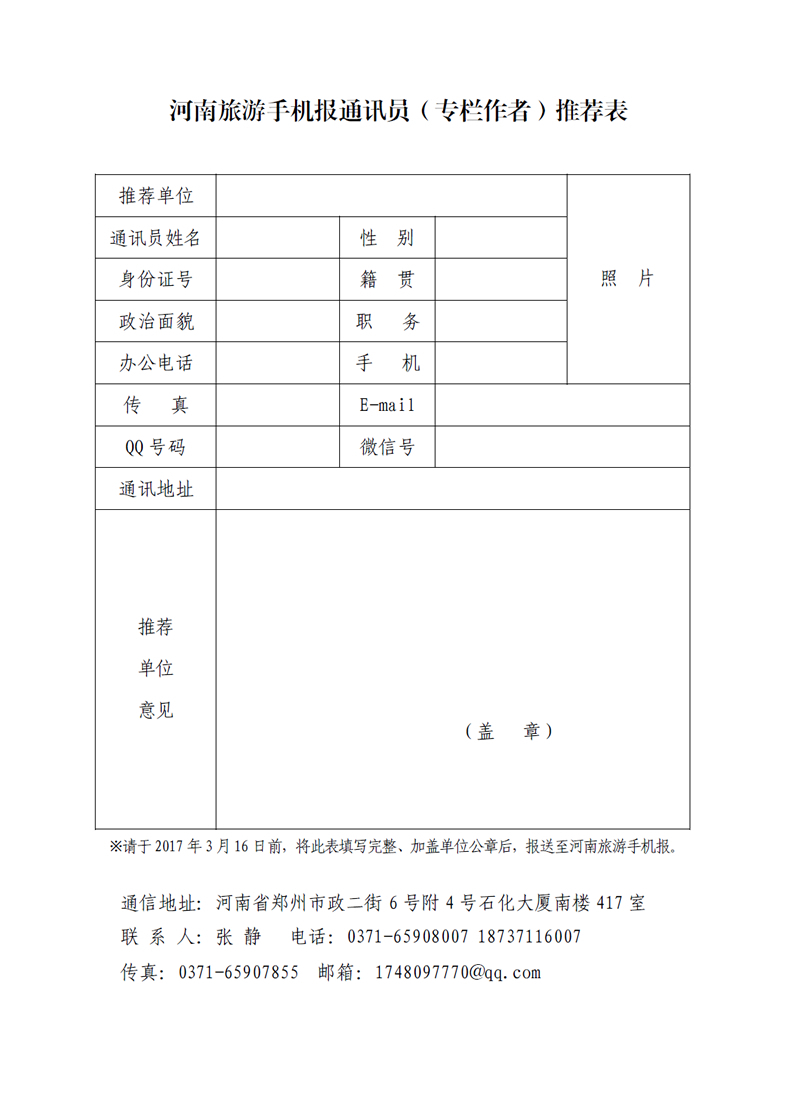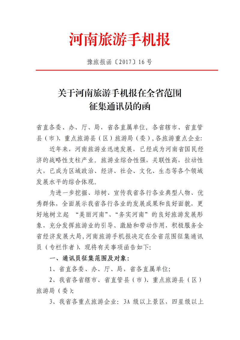 為進(jìn)一步挖掘、培樹(shù)、宣傳我省各行各業(yè)典型人數(shù)、優(yōu)秀群體,全面展示我省各行各業(yè)的發(fā)展成果和良好面貌,更好地樹(shù)立起“美麗河南”、“務(wù)實(shí)河南”的良好旅游發(fā)展形象,充分發(fā)揮旅游業(yè)的引導(dǎo)、激勵(lì)和帶動(dòng)作用,積極服務(wù)全省經(jīng)濟(jì)發(fā)展大局,河南旅游手機(jī)報(bào)決定在全省范圍征集通訊員(專欄作者),每個(gè)單位限推薦通訊員1名,2017年3月16日截止。