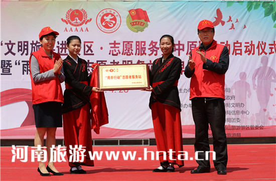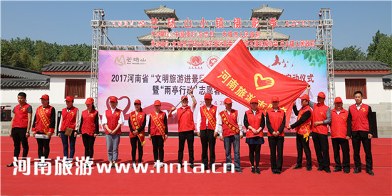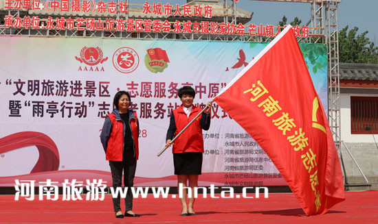芒碭山志愿者服務(wù)代表 李敏隊長宣讀旅游志愿服務(wù)倡議書。河南省旅游局辦公室調(diào)研員張九菊向青年志愿者服務(wù)隊授旗。河南省旅游局信息中心副主任謝堅、芒碭山旅游開發(fā)總公司總經(jīng)理魯玉 共同為“雨亭行動”志愿者服務(wù)站揭牌。