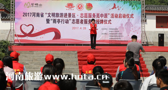 4月28日上午,由河南省旅游局 永城市人民政府主辦,河南省旅游局文明辦、河南省旅游局信息中心、河南省旅游局團(tuán)委、永城市文物旅游局、永城芒碭山文物旅游區(qū)管委會承辦、永城市芒碭山旅游總公司協(xié)辦的2017河南省“文明旅游進(jìn)景區(qū)·志愿服務(wù)亮中原”啟動儀式暨“雨亭行動”志愿者服務(wù)站揭牌儀式在芒碭山旅游區(qū)隆重舉行。河南省旅游局辦公室調(diào)研員張九菊、永城市人民政府黨組成員芒碭山旅游景區(qū)管委會主任張福光、河南省旅游局信息中心副主任謝堅、永城市文物旅游局局長高全舉,芒碭山旅游總公司總經(jīng)理魯玉等出席開幕式。
