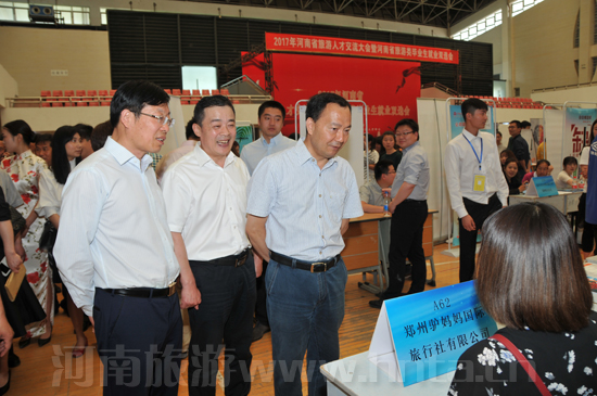 為促進(jìn)我省旅游類畢業(yè)生順利就業(yè),解決全省旅游企業(yè)人才短缺的難題,5月12日,由省旅游局、省教育廳聯(lián)合主辦,河南省旅游局人才中心和鄭州旅游職業(yè)學(xué)院具體承辦的“2017河南省旅游人才交流大會(huì)暨旅游類畢業(yè)生就業(yè)雙選會(huì)”在鄭州旅游職業(yè)學(xué)院隆重開(kāi)幕。河南省旅游局黨組書記、局長(zhǎng)寇武江宣布大會(huì)開(kāi)幕,省旅游局黨組成員、副局長(zhǎng)周耀霞出席開(kāi)幕式并講話。