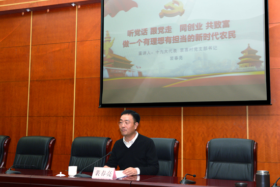 裴春亮同志結(jié)合自己出席十九大的親身感受和對十九大精神的學(xué)習(xí)體會,以《聽黨話跟黨走,同創(chuàng)業(yè)共致富,做一個有理想有擔(dān)當(dāng)?shù)男聲r代農(nóng)民》為題,從“十九大盛況、對十九大報告的初步理解、新時代眷顧腳踏實地的弄潮兒、新時代鄉(xiāng)村振興戰(zhàn)略需要有新作為、不忘初心積極投身新時代的偉大實踐”五個方面深入宣講解讀了黨的十九大精神。他從身邊一件件小事說起,舉例子、擺事實、講道理,圍繞自身工作生活經(jīng)歷和農(nóng)村發(fā)展變化,用真摯樸實、通俗易懂的語言深入淺出的闡述了黨的十九大精神,條理清晰、邏輯嚴密、通俗易懂,十分接地氣,既有理論高度、又有思想深度。談到十九大報告提出的“綠水青山就是金山銀山”時,裴春亮說旅游業(yè)是最具潛力的朝陽產(chǎn)業(yè),不僅保護了環(huán)境還富了農(nóng)民,成為滿足人民群眾物質(zhì)生活和精神生活的重要途徑,“以前大家打招呼都是‘吃了沒有’,現(xiàn)在見面都是‘最近去哪旅游了’”。談到習(xí)近平新時代中國特色社會主義思想時,裴春亮說,十九大期間,代表們討論報告談得最多的、感觸最深的就是習(xí)大大的治國理政,認為習(xí)總書記在關(guān)鍵時刻挽救了黨、挽救了國家、挽救了人民軍隊。用老百姓的話說“毛澤東是人民的救星,習(xí)近平是人民的福星。中國出了個習(xí)近平是國之幸!民之幸!黨之幸!”